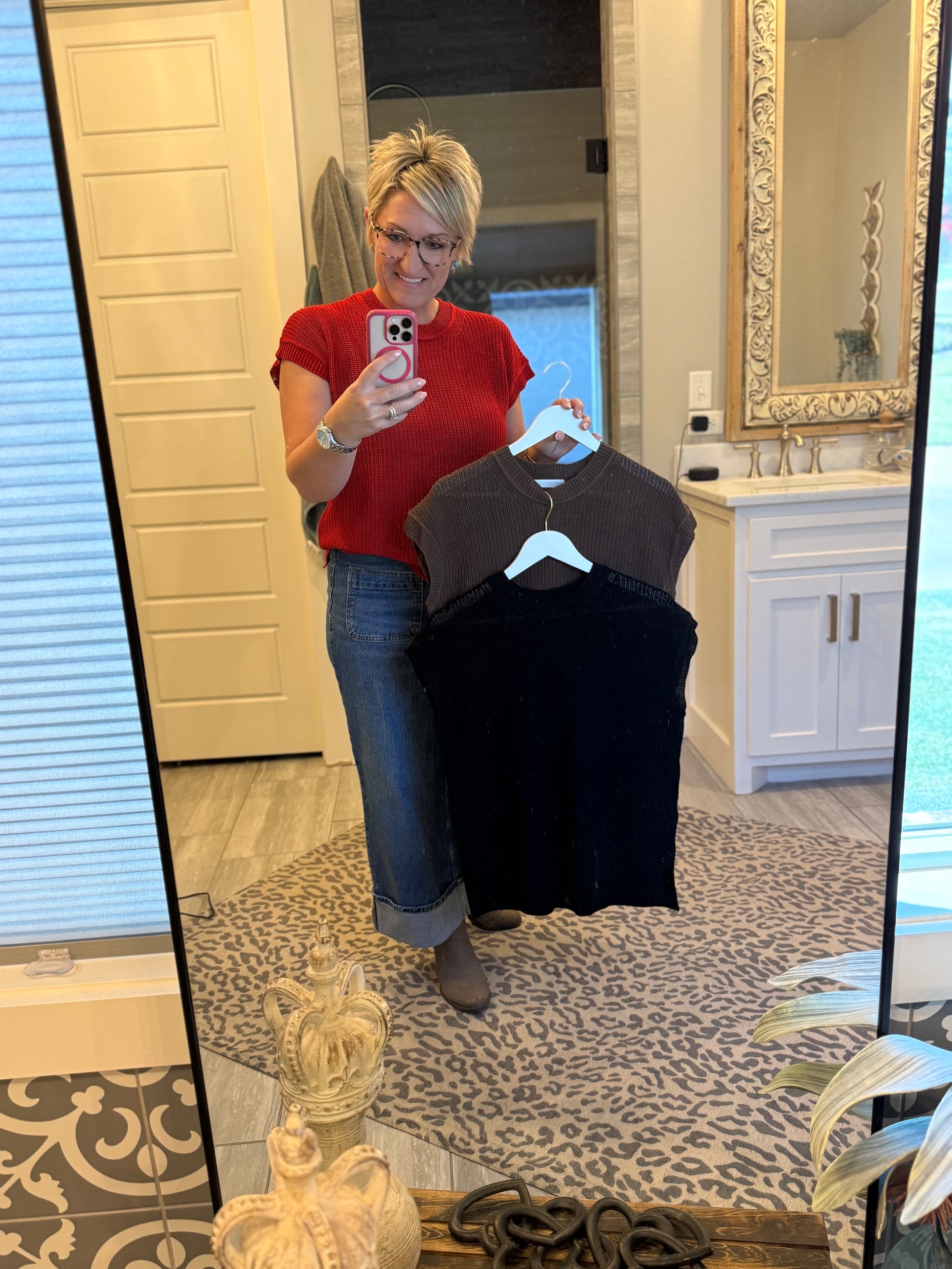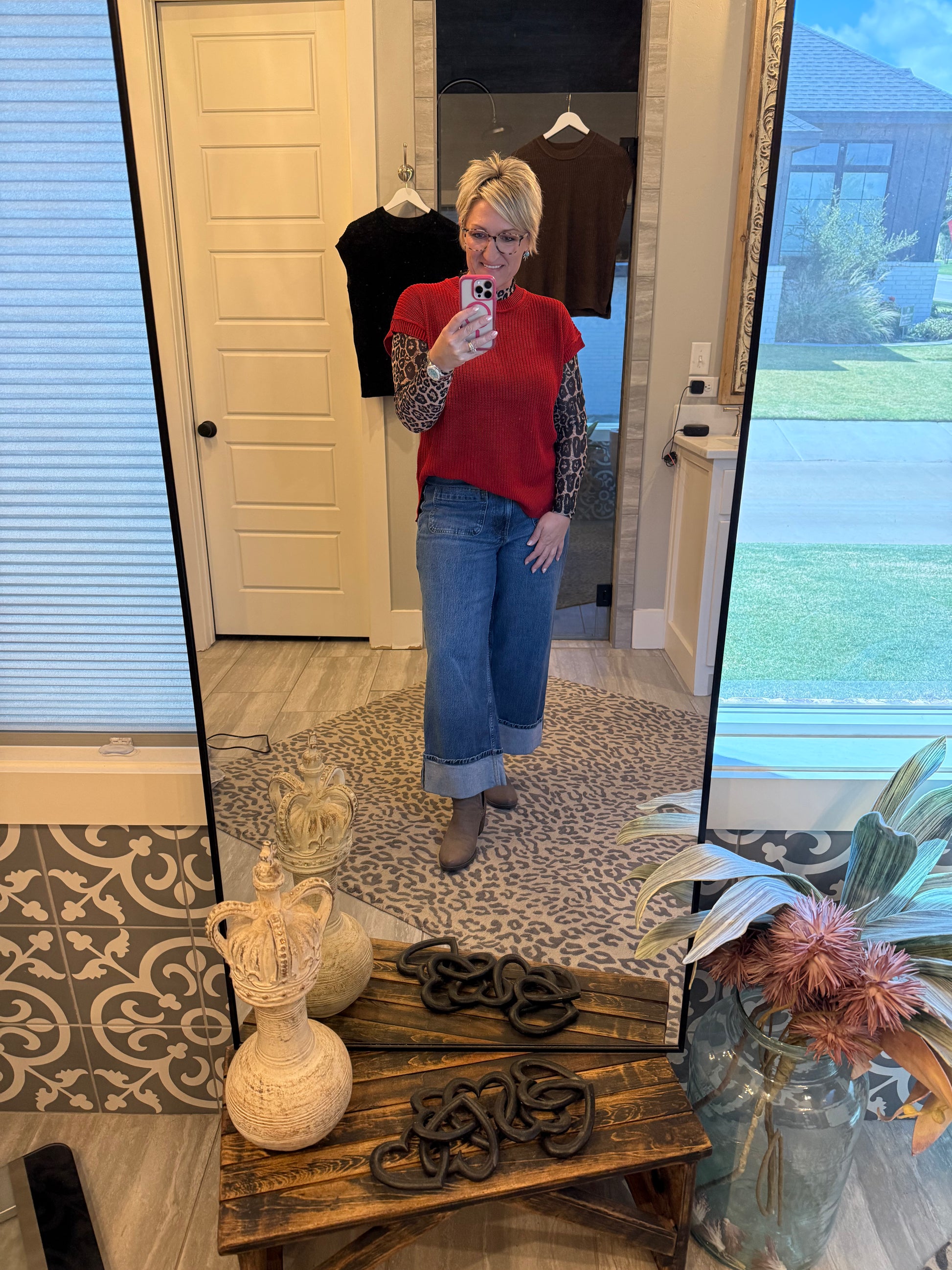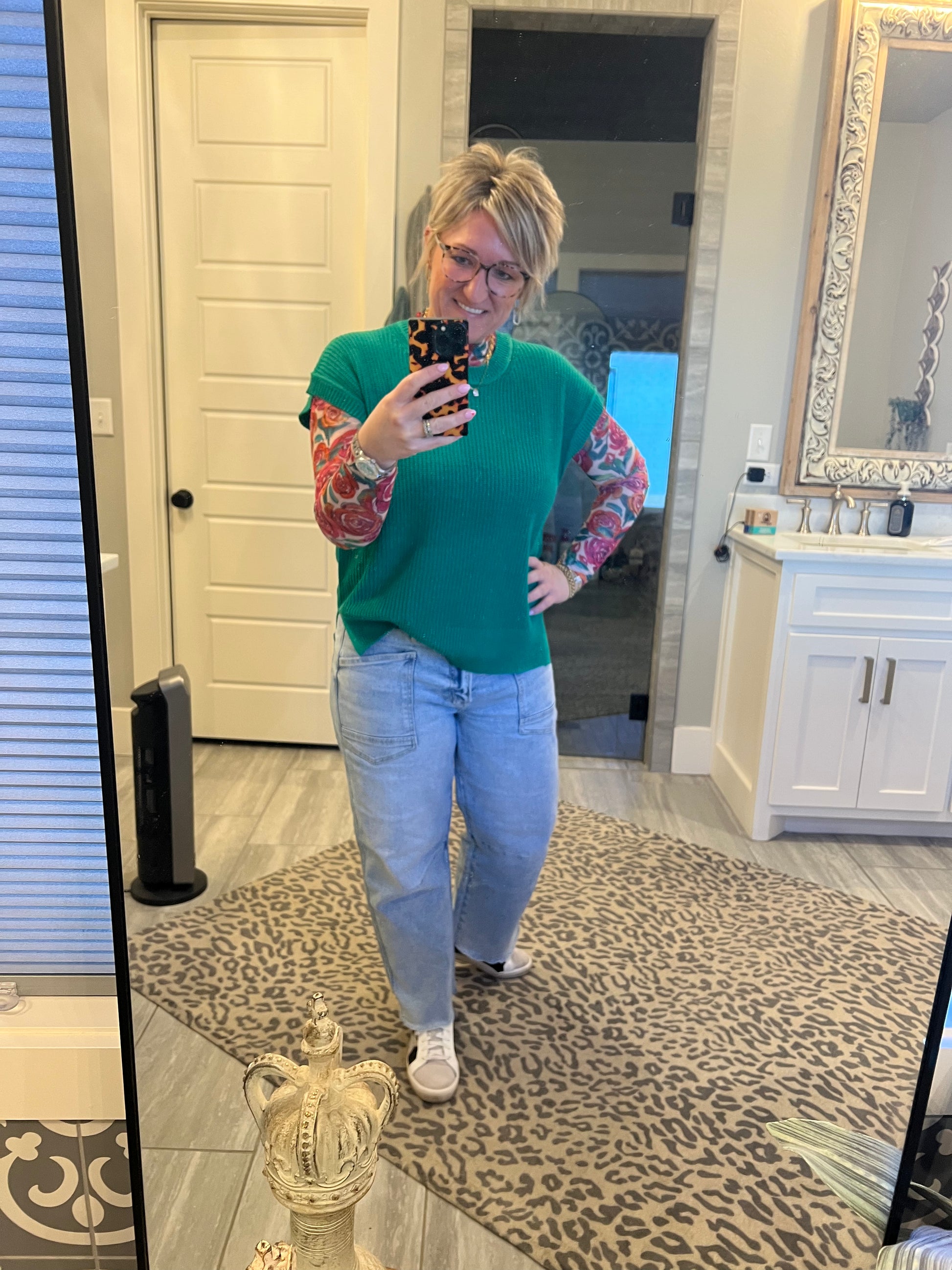 This Oversized CrewNeck Sweater Vest is so cute and perfect for adding all your fun mesh tops under it!!! OR you can wear it just like the model is. Perfect to wear now with our cooler days and transitioning into Spring/Summer!!