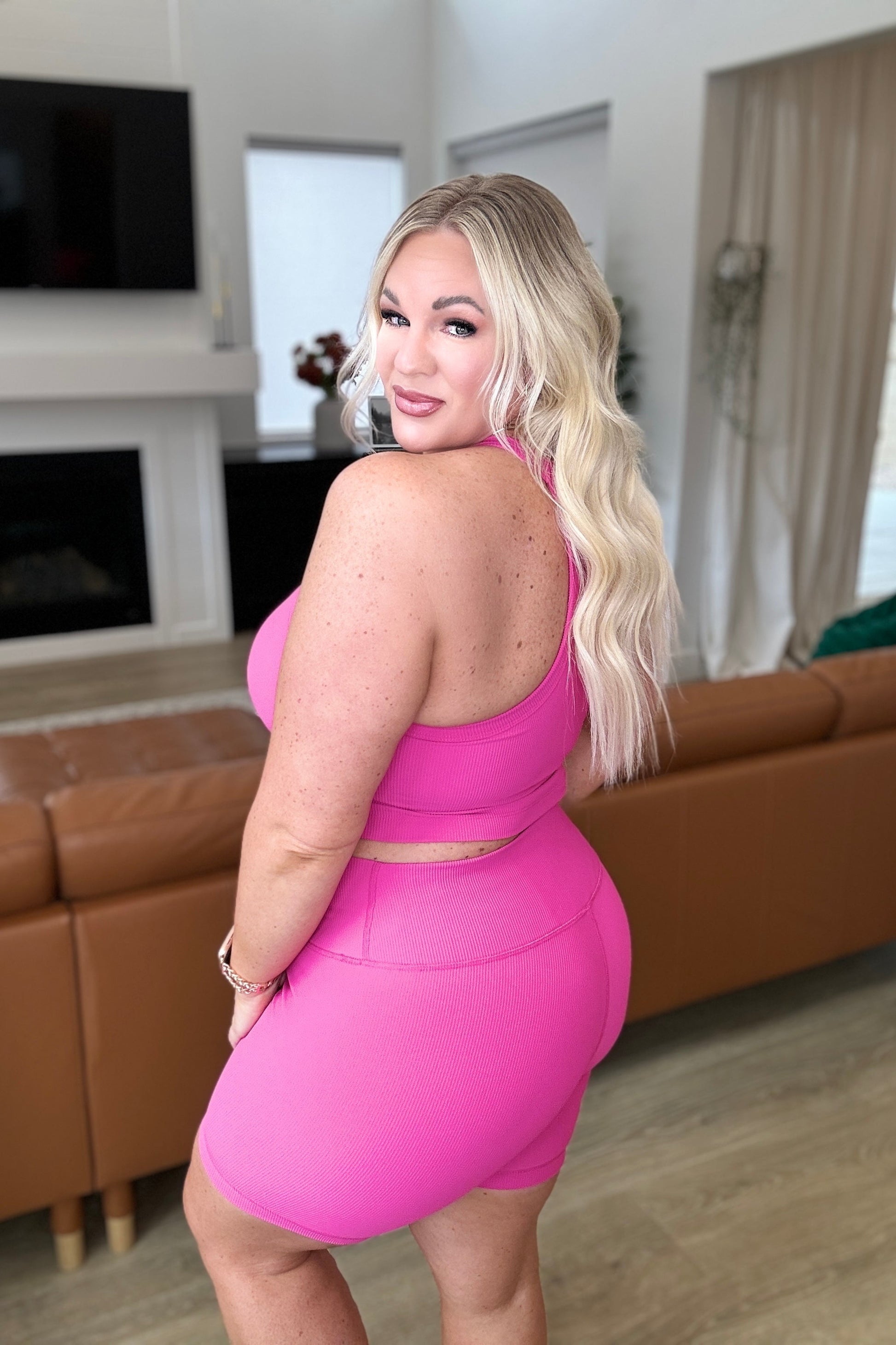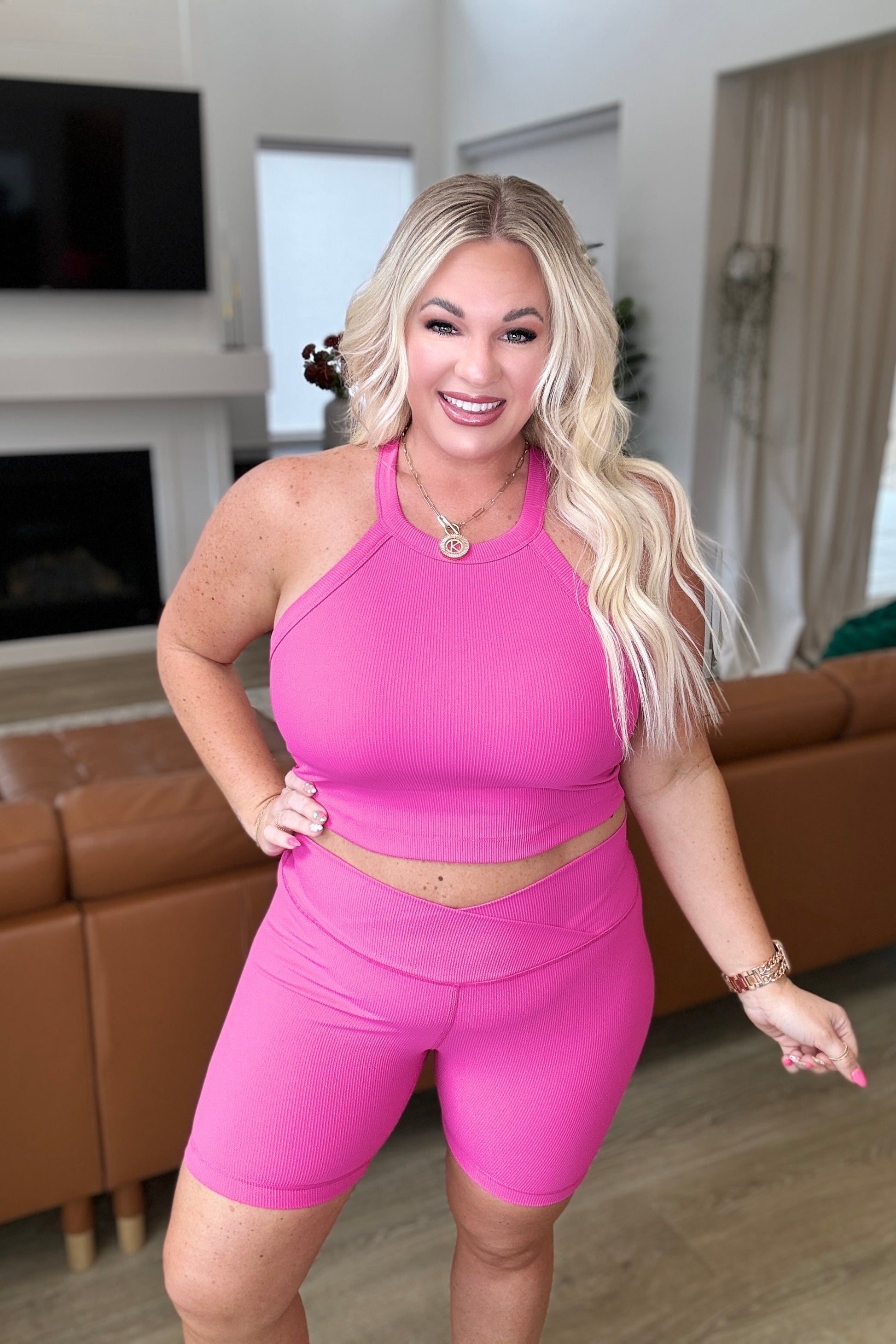 Take your workout to the next level with our I'm Walkin' Here Biker Shorts.**FINAL SALE** Made with high stretch material and a ribbed design, these high waisted shorts will provide ultimate comfort and flexibility. The cross front waistband adds a unique touch, while the pocket on the inside back side of the waistband allows for convenient storage.