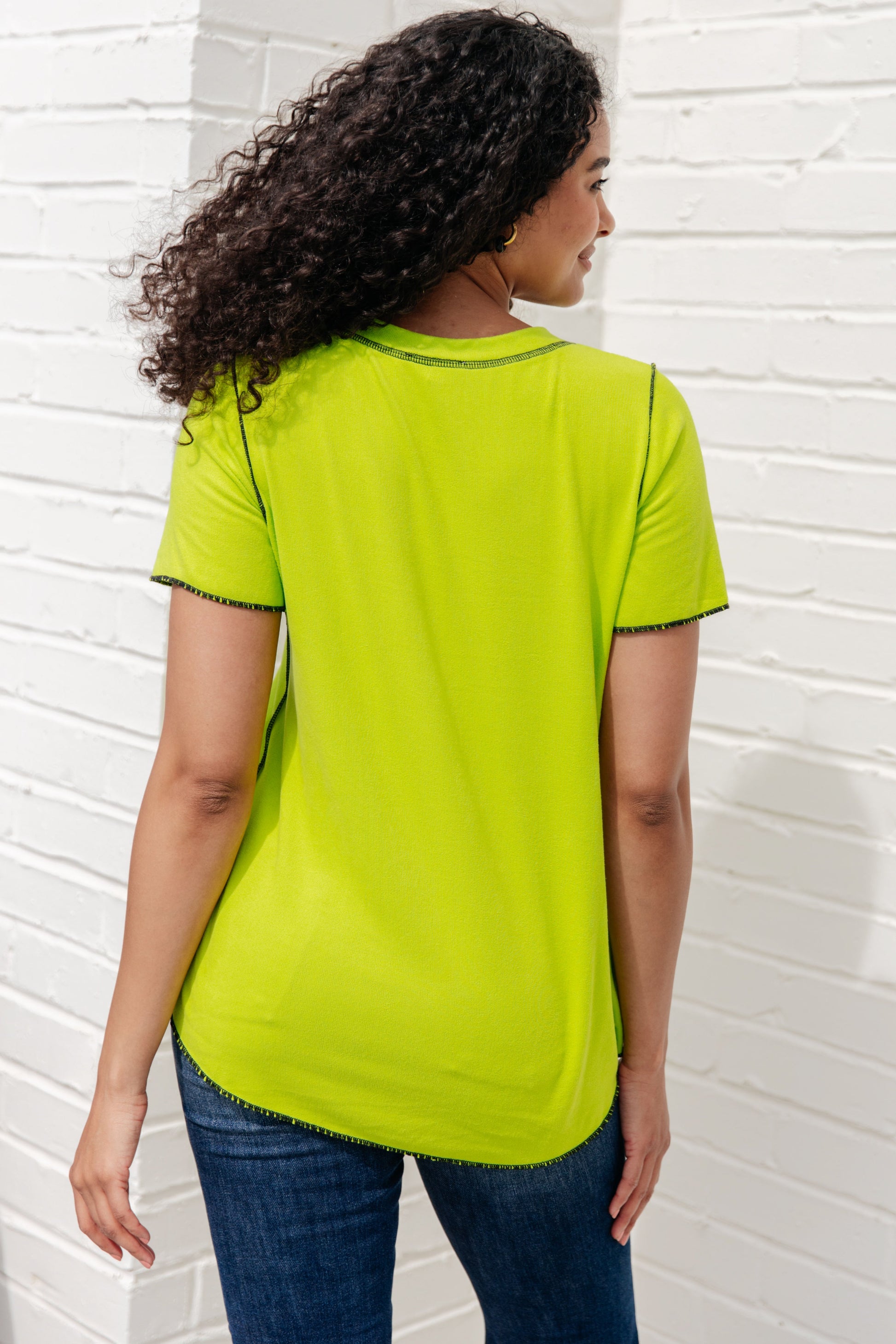 Get ready to add a pop of color to your wardrobe with our Lemons and Limes Contrast Top! Made with highly brushed terry cloth and featuring raglan sleeves and exposed contrasted seams, this top is not only stylish but also comfortable. The rounded hem adds a playful touch.