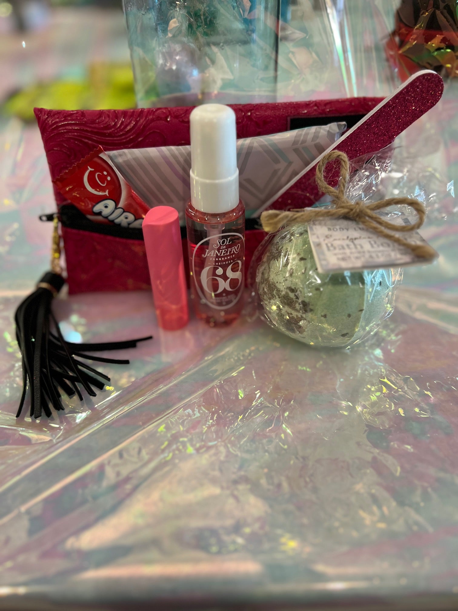 MakeUp Junkie Bag, Sol De Janeriro body spray, Bath Bomb, chapstick, file, and Kleenex